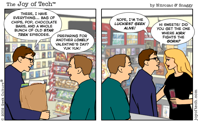 HomeGeek Culture... Geek Love, Geek Files, Mind Numbing Magazine, all kinds of geeky stuff!The Webstore! Get some cool stuff, and support your fave comic creators!e-Cards!The ForumsThe Joy of Tech! ...your quick fix of comic fun!After Y2K!webcam!