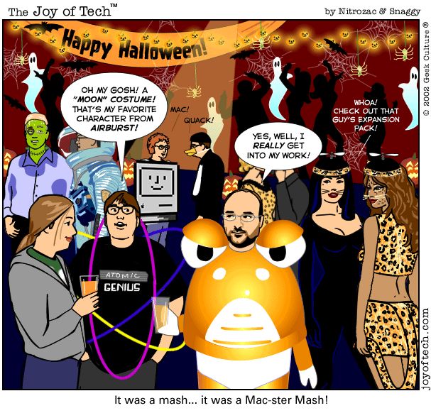 If you're using a Mac and a newer version of Explorer, here's a neat trick courtesy of MacMerc. Drag the above little image to the top tool bar of your browser, it should "stick" afterwards. Now you have a graphical link to the Joy of Tech, one that will update everytime a new comic is uploaded. (You may have to refresh the image manually if it's in your cache.) If you need to delete or move it it, just control button/click and hold, then select delete, or just Command/drag it to the trash.