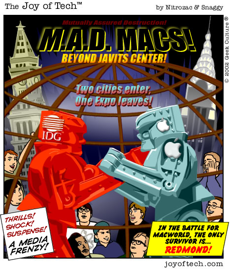 If you're using a Mac and a newer version of Explorer, here's a neat trick courtesy of MacMerc. Drag the above little image to the top tool bar of your browser, it should "stick" afterwards. Now you have a graphical link to the Joy of Tech, one that will update everytime a new comic is uploaded. (You may have to refresh the image manually if it's in your cache.) If you need to delete or move it it, just control button/click and hold, then select delete, or just Command/drag it to the trash.