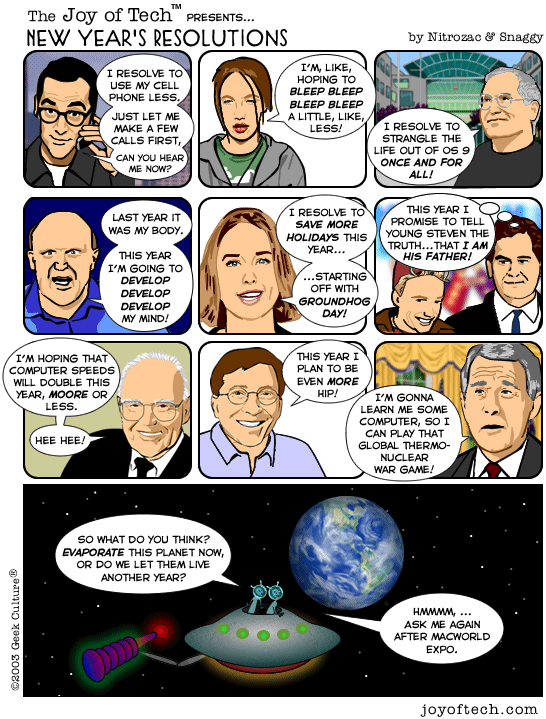 If you're using a Mac and a newer version of Explorer, here's a neat trick courtesy of MacMerc. Drag the above little image to the top tool bar of your browser, it should "stick" afterwards. Now you have a graphical link to the Joy of Tech, one that will update everytime a new comic is uploaded. (You may have to refresh the image manually if it's in your cache.) If you need to delete or move it it, just control button/click and hold, then select delete, or just Command/drag it to the trash.