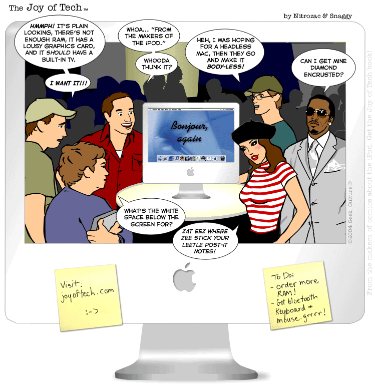 Speaking of the new iMac, Callipygous insists we Alright now form an orderly cue,... Raging Dragon's computer is randomly resetting,... Allan inflates a Blow Up , finds Hand Relief Lost in translation , and sets a New land speed record.