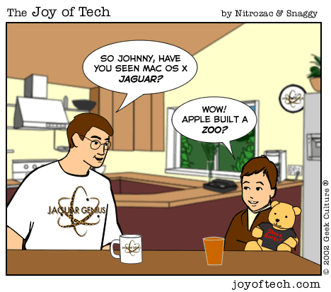 If you're using a Mac and a newer version of Explorer, here's a neat trick courtesy of MacMerc. Drag the above little image to the top tool bar of your browser, it should "stick" afterwards. Now you have a graphical link to the Joy of Tech, one that will update everytime a new comic is uploaded. If you need to delete or move it it, just Command/drag it around, or to the trash.